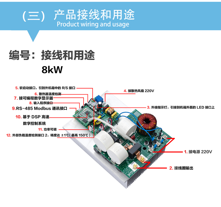 8kW/220V電磁加熱控制板是一種多用途的高效加熱節(jié)能產(chǎn)品,具有節(jié)電效果顯著,升溫速度快,熱效率高,降低生產(chǎn)環(huán)境溫度等顯著特點(diǎn)。本產(chǎn)品是采用本公司第五代數(shù)字處理平臺(tái)技術(shù),嵌入式32位處理系統(tǒng),全數(shù)字鎖相跟蹤處理。主板接口豐富,支持標(biāo)準(zhǔn)modbus RTU通訊協(xié)議,可輕而易舉實(shí)現(xiàn)觸摸屏人機(jī)對(duì)話、遠(yuǎn)程控制。可廣泛應(yīng)用于炒貨機(jī),智能炒菜設(shè)備,小型管道,平面比較大功率密度加熱。效率可達(dá)98%。