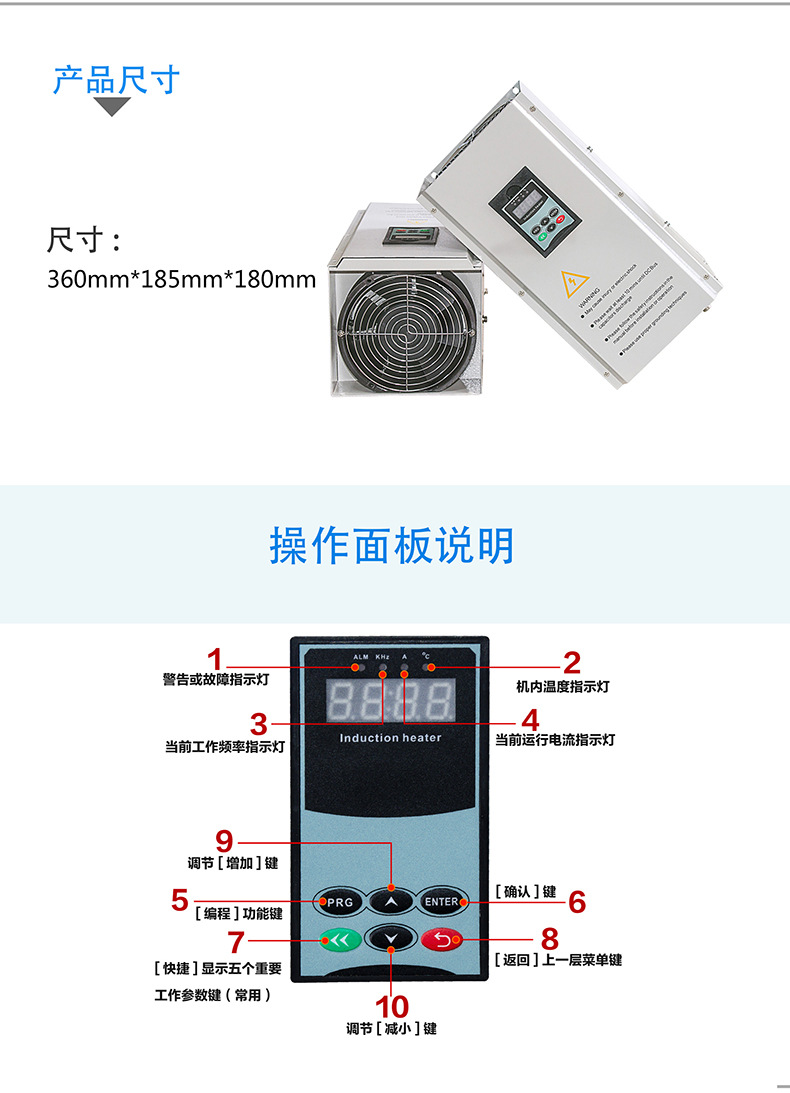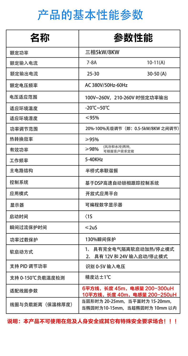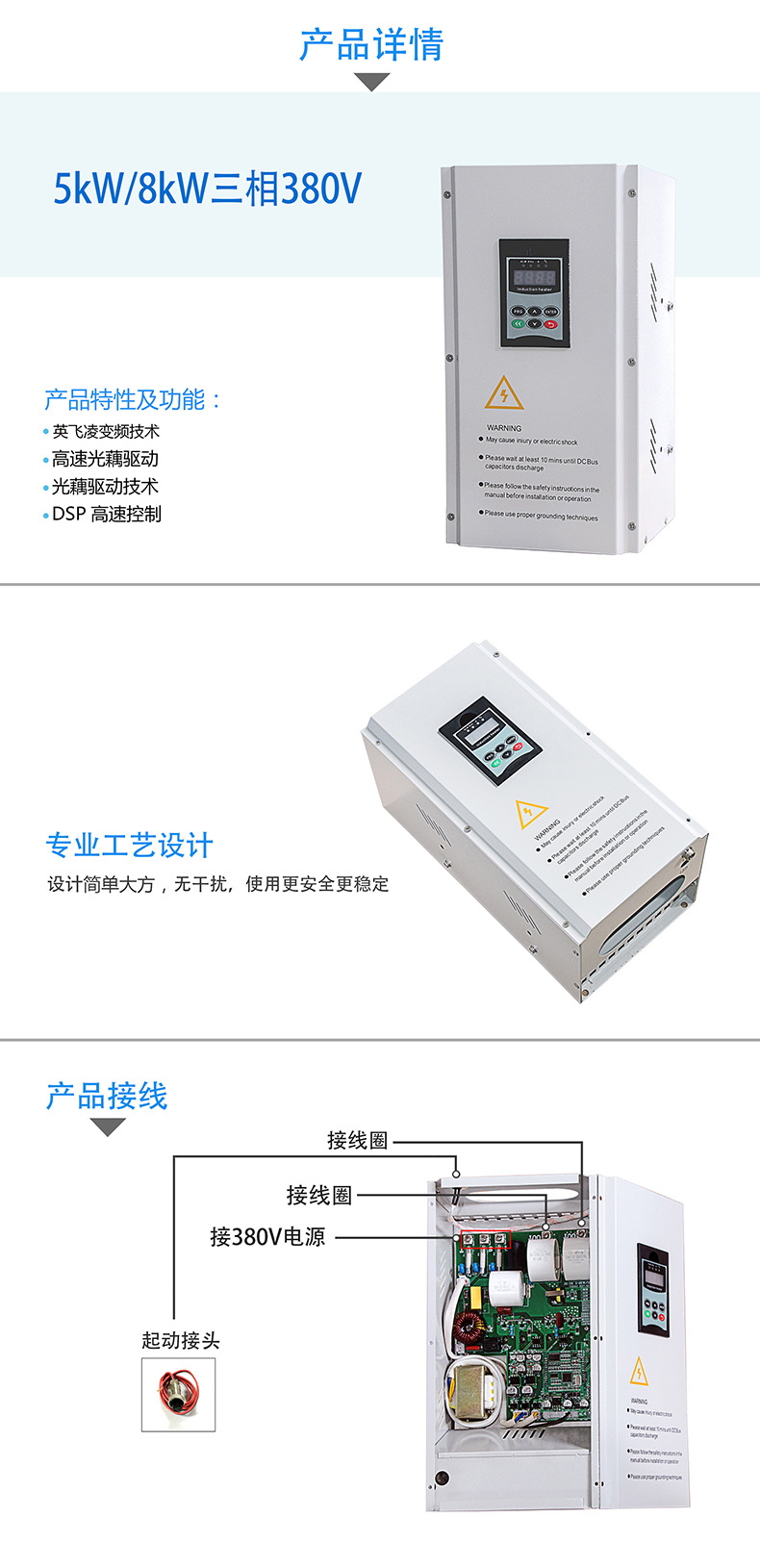三相5KW、8KW/380V電磁加熱控制器為江信電子全新一代電磁加熱節(jié)能產(chǎn)品,專門針對塑料機械、橡膠設備加熱,智能炒菜機設計,安裝調(diào)試簡單方便,具有節(jié)電效果顯著,升溫速度快,熱效率高等顯著特點。采用本公司第五代數(shù)字處理平臺技術,嵌入式 32位處理系統(tǒng),全數(shù)字鎖相跟蹤處理。主板接口豐富,支持標準RS-485通訊,Mod-bus RTU協(xié)議,可輕而易舉實現(xiàn)人機對話,遠程控制。而且具有跟蹤速度快,精度高,可調(diào)性強,線圈適應強,安裝方便,調(diào)試,簡單等優(yōu)點。
