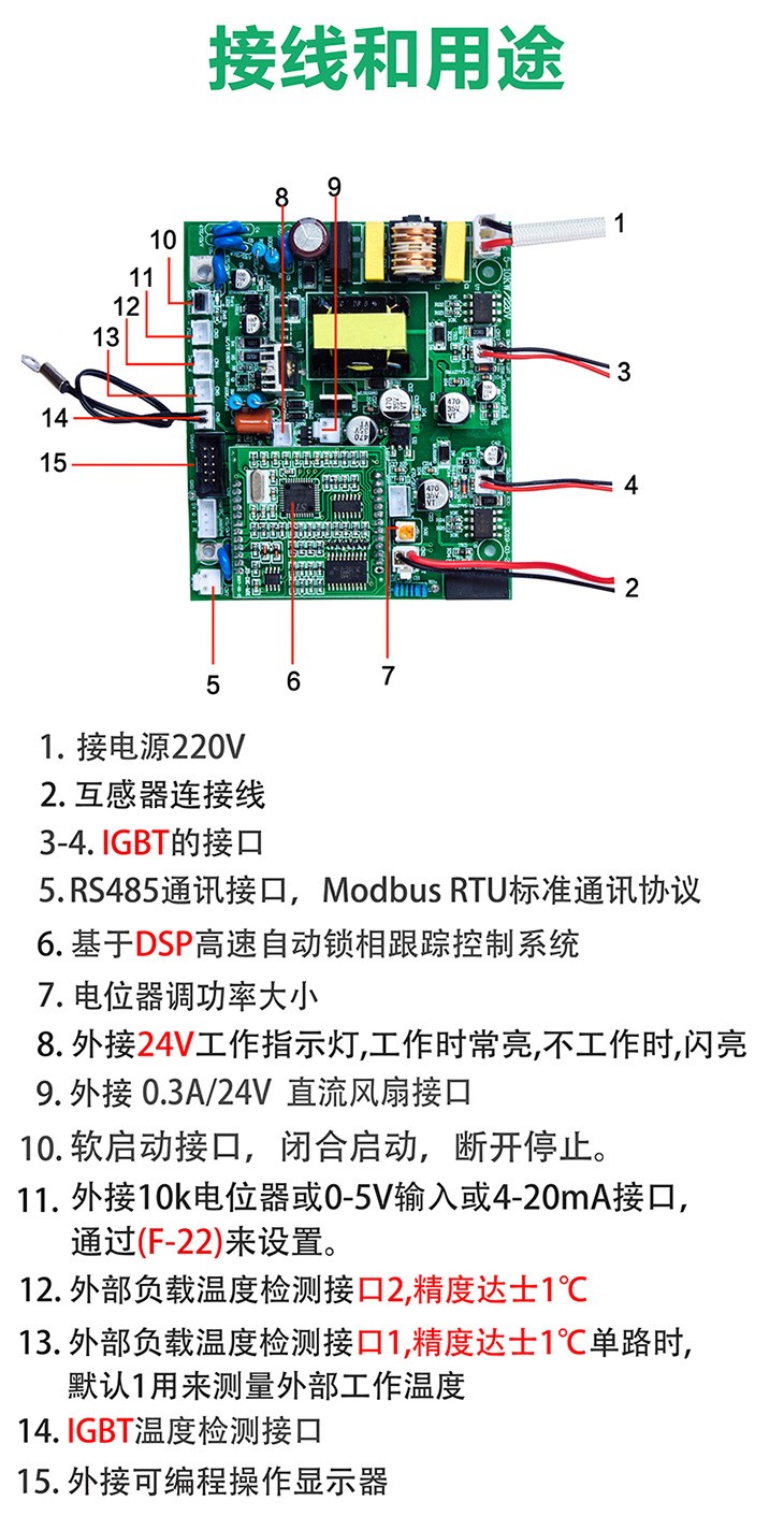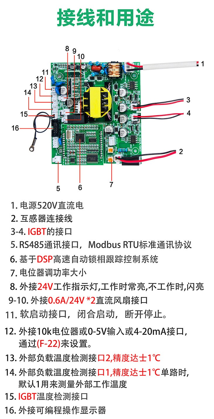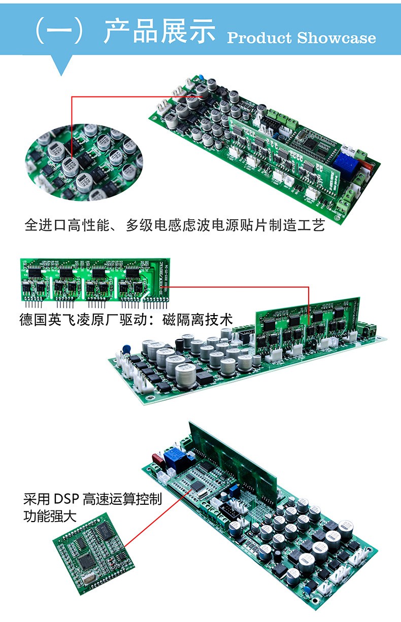 單相半橋1KW~10KW或三相全橋/半橋5KW~30KW電磁加熱驅動板,能應用于簡單的電磁加熱系統(tǒng)之中,也可配套自動化系統(tǒng),并預留工業(yè)485總線與計算機鏈接通訊接口,滿足自動化控制中的接口需求。對于單相可應用于1~10KW電磁加熱驅動,最大可驅動150A/1200V IGBT。對于三相可應用于5~30KW全橋/半橋電磁加熱驅動,最大可驅動450A/1200V IGBT.集成了全數(shù)字核心控制器和IGBT驅動器,外部只加IGBT模塊、整流橋堆、諧振電容、散熱器等器件就可以組裝成高性能電磁感應加熱系統(tǒng)